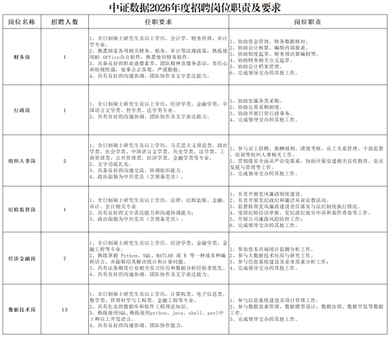 <b>中证数据2026年度招聘公告<br /><br />一、公司简介<br />中证数据有限责任公司(简称“中证数据”)成立于2012年9月,是中国证监会直接管理的下属专业机构,是我国资本市场的数据管理中心和业务分析中心。<br />中证数据承担证券期货业监管大数据中心的建设、运行和维护,负责数据采集、加工、汇总、存储、管理和治理;协助统筹中国证监会监管大数据分析需求,包括统计查询、风险监测、数据挖掘及其他监管应用;根据大数据分析需求,提出大数据监管应用系统和分析软件需求,按相关规定提交开发机构开发,并参与上线测试,负责验收;按照相关规定提供数据及分析等服务;承办中国证监会交办的其他工作。<br />根据业务发展需要,现面向海内外公开招募IT技术、经济金融、财务行政、组织人事、纪检监督等专业人员,欢迎有志于投身中国资本市场科技监管工作的优秀青年踊跃报名!<br />二、招聘对象<br />招聘对象为应届毕业生。其中境内院校毕业生应于2026年7月31日前取得相应学历学位证书,境外院校毕业生原则上应于2026年7月31日前取得相应的学历学位证书及教育部留学服务中心的学历学位认证。<br />三、招聘基本条件<br /></b>